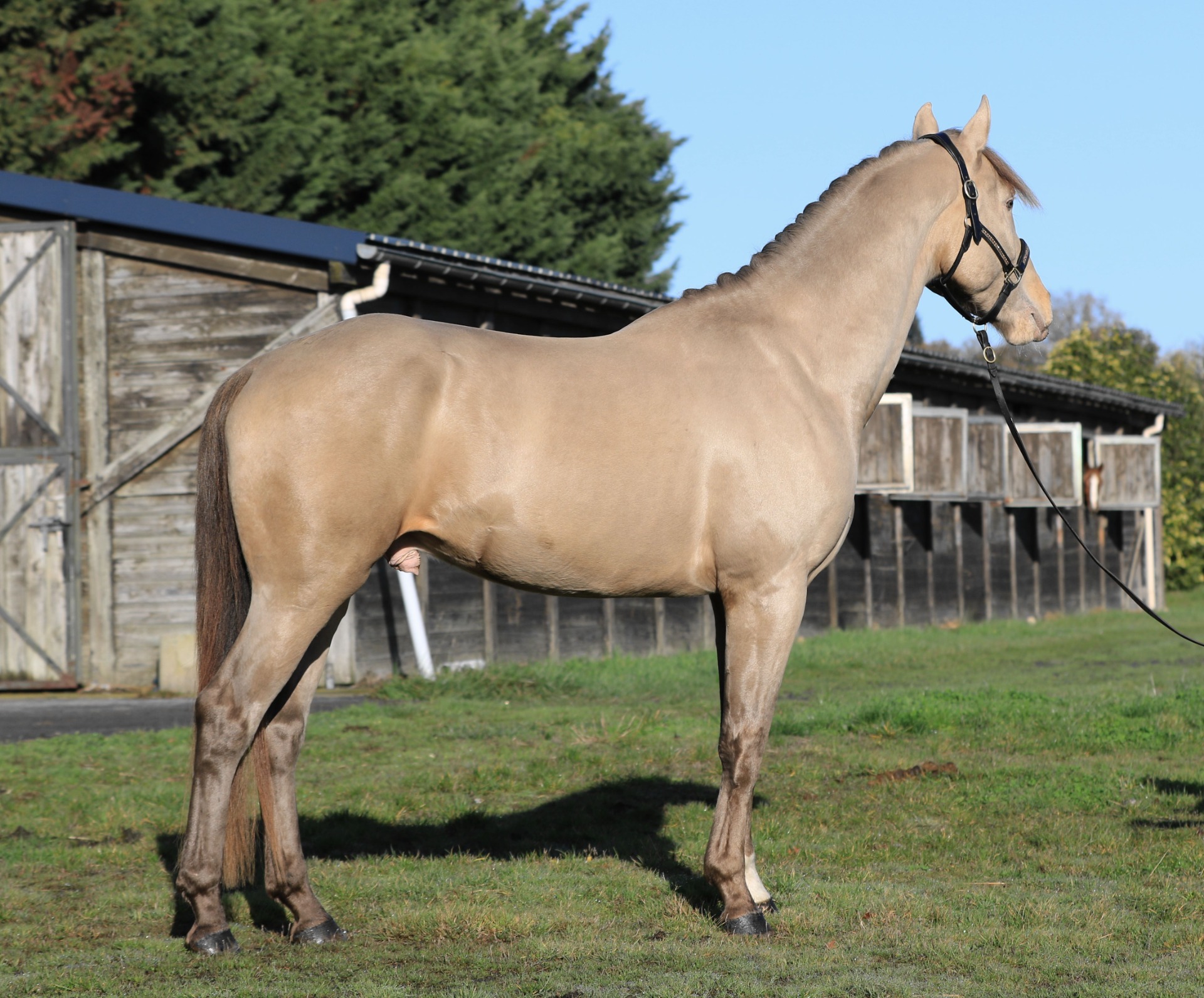 Shinegro CH est un étalon fin et moderne, qui séduit avant tout par sa gentillesse remarquable et la qualité de sa locomotion. Sans chercher le grand cadre ni la force, il s'impose par son expression, sa souplesse et ses allures élastiques et brillantes, avec un dos mobile et un galop fluide, facile à accompagner. Côté origines, il est fils de Negro, père du mythique Valegro, et son grand-père maternel est Cream On Top, étalon valorisé en CSO jusqu'à 1m40. Au quotidien, Shinegro CH est ultra gentil, proche de l'homme, volontaire et très facile à utiliser — un vrai atout pour produire des chevaux agréables et bien dans leur tête. En élevage, il convient particulièrement pour apporter mental, chic et locomotion, notamment sur des juments avec du cadre ou de la force, afin d'obtenir des produits élégants, expressifs et faciles à valoriser.